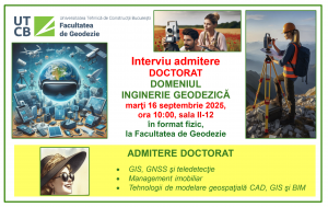 INTERVIU ADMITERE LA STUDII UNIVERSITARE DE DOCTORAT IN DOMENIUL INGINERIE GEODEZICA – 16 septembrie 2025, ora 10, sala II 12