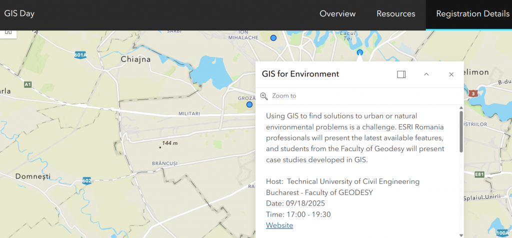 Studentii din toti anii de studii de la licenta, master si doctorat, dar si specialistii interesati au participat la GIS DAY 2025 pe data de 18 noiembrie 2025, amfiteatrul P6, ora 17. Evenimentul a fost sprijinit de ESRI Romania.